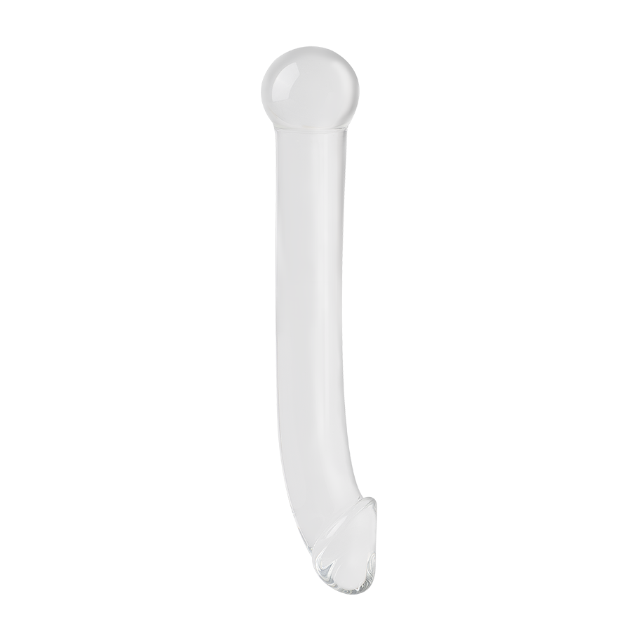Dildo de vidrio, su cabeza tiene una forma realista, su textura es lisa y su base tiene un nódulo que puede ser utilizable para la penetración.