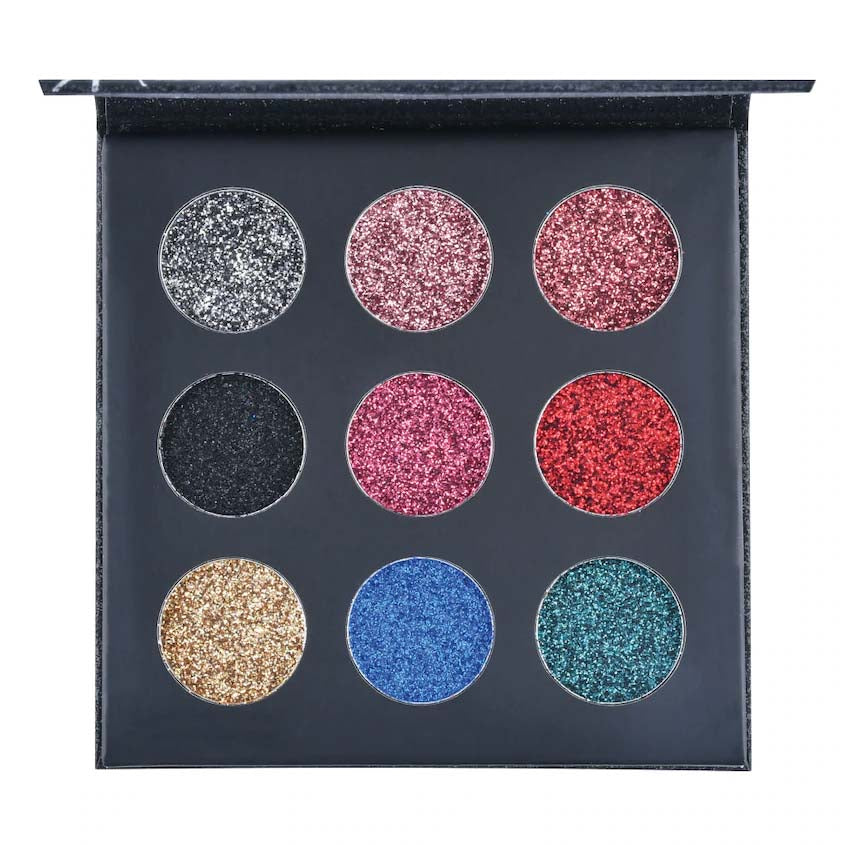 La paleta Shine es una paleta de glitter prensado, con 9 tonos de brillo puro, perfecta para los amantes del brillo.