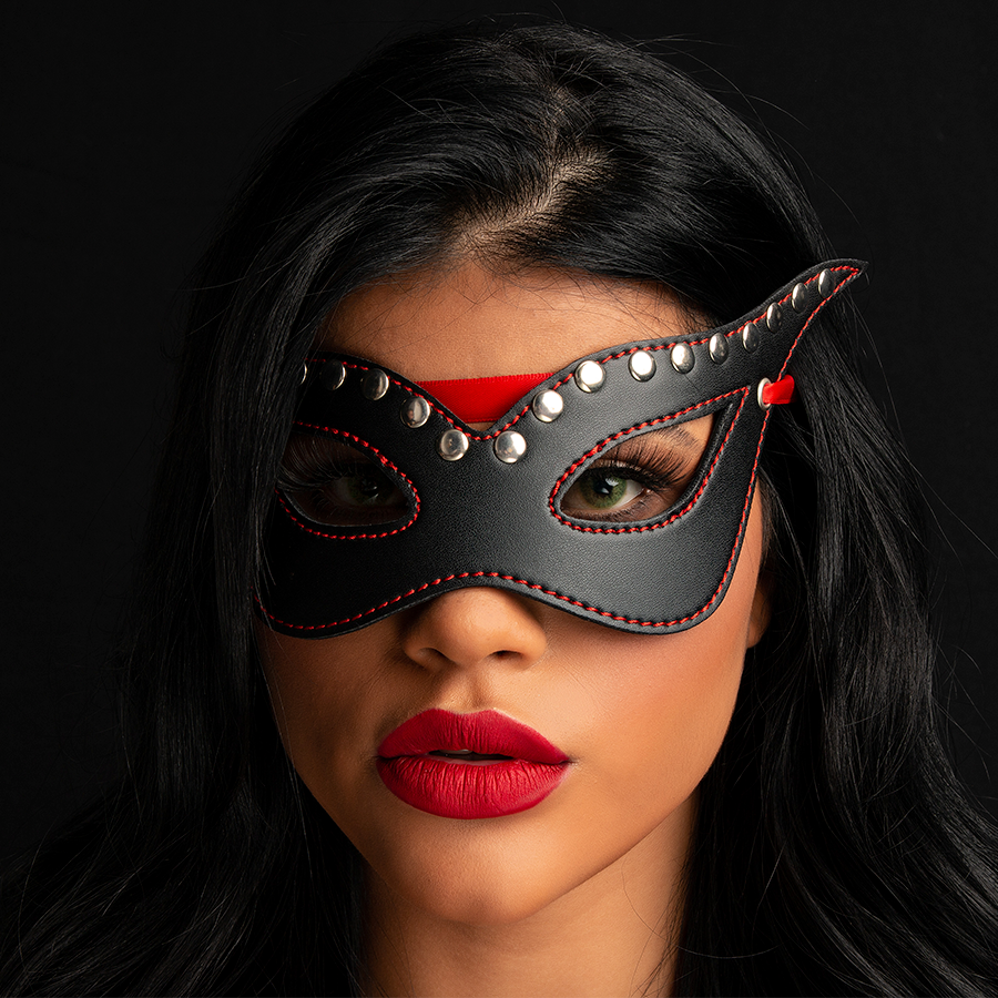 Antifaz tipo carnaval en cuero sintético con pequeños taches en la parte superior y sistema de amarre en cintas.