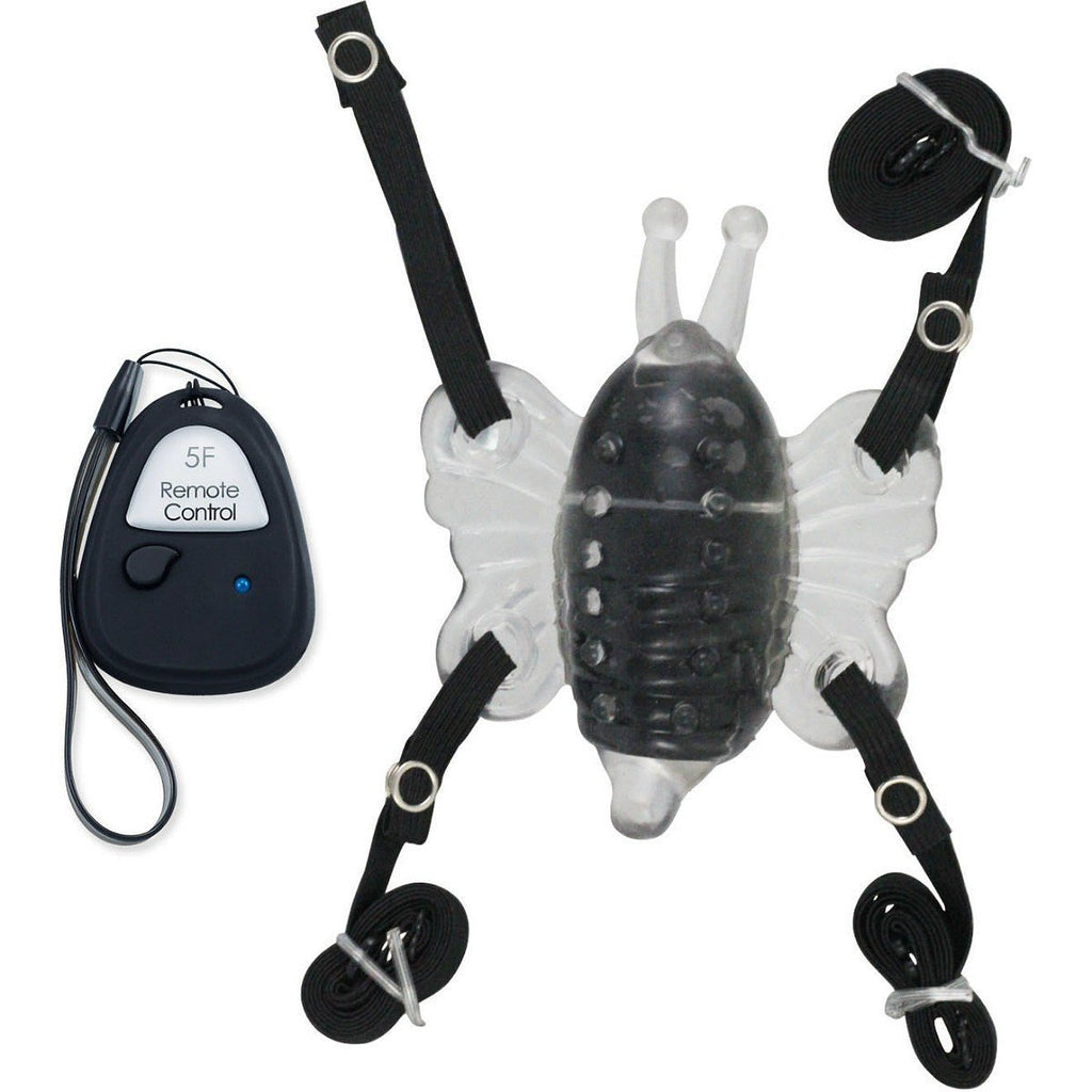 Vibrador a control remoto de 5 funciones, con correas que se ajustan al cuerpo. Puede usarse bajo la ropa de forma discreta. A prueba de agua.
